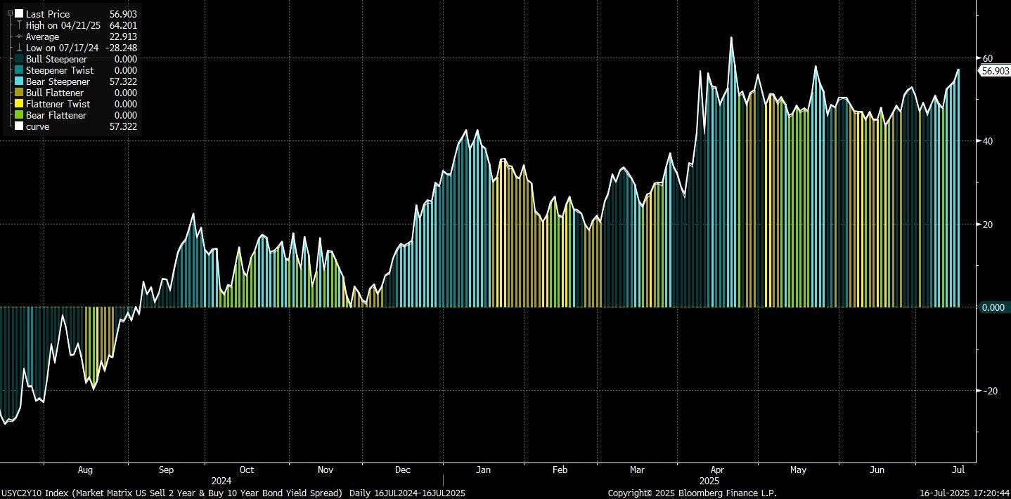 Long-end Treasuries are under siege again, continuing their long winter of underperformance. The 30-year yield breached 5% this week, and derivatives markets lit up with fresh downside bets. For a while, the prevailing view was that softening inflation and a near-term Fed pivot would pull yields lower. But that narrative is fracturing. Trade protectionism, fiscal expansion, and the politicisation of monetary policy are reawakening fears of entrenched inflation and sovereign risk. The result: a deepening bear steepener in US rates, led by the long bond.