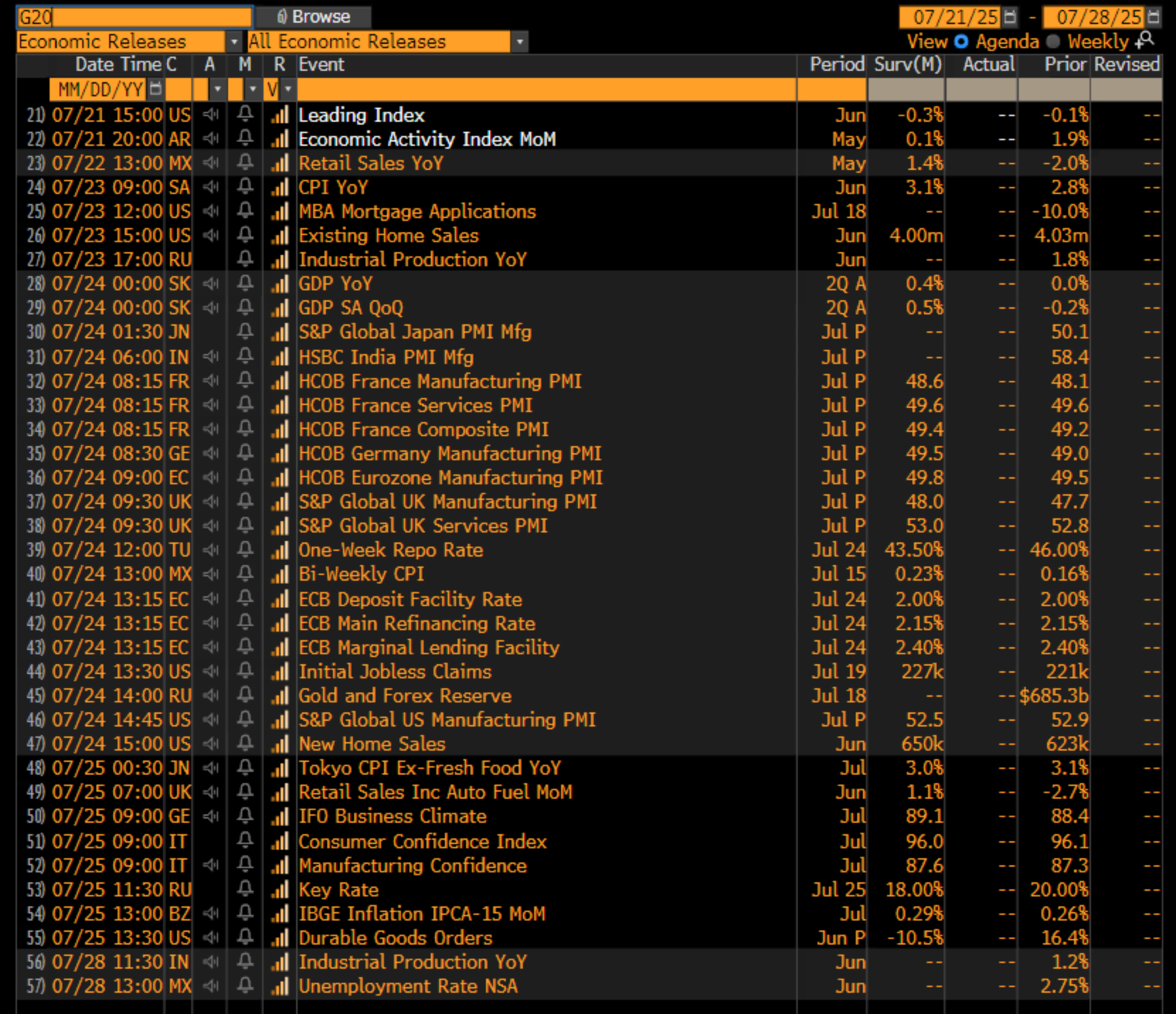 In the US, Markets will focus on provisional PMI surveys for July, offering the first look at how US manufacturing and services activity is holding up amid tariff uncertainty. While the economy has shown resilience in recent data, investors remain alert for signs that Trump’s trade policies are pushing up prices or dampening business sentiment. Existing and new home sales data, weekly jobless claims, and durable goods orders round out a light calendar. Treasury auctions include $13 billion in 20-year bonds on Wednesday and $21 billion in TIPS on Thursday. Markets also await any movement on tariff negotiations ahead of the August 1 deadline for reciprocal measures.
