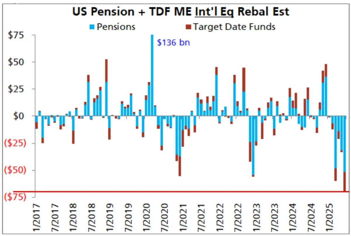 UBS estimates that pension and target date fund rebalancing into month-end could drive $89bn of equity selling, the largest monthly total this year. The bulk of the pressure is expected to fall on international equities, which have outperformed the US and may see $69bn in outflows, a new record in UBS’s data. US equities are set for a more modest $20bn of selling.