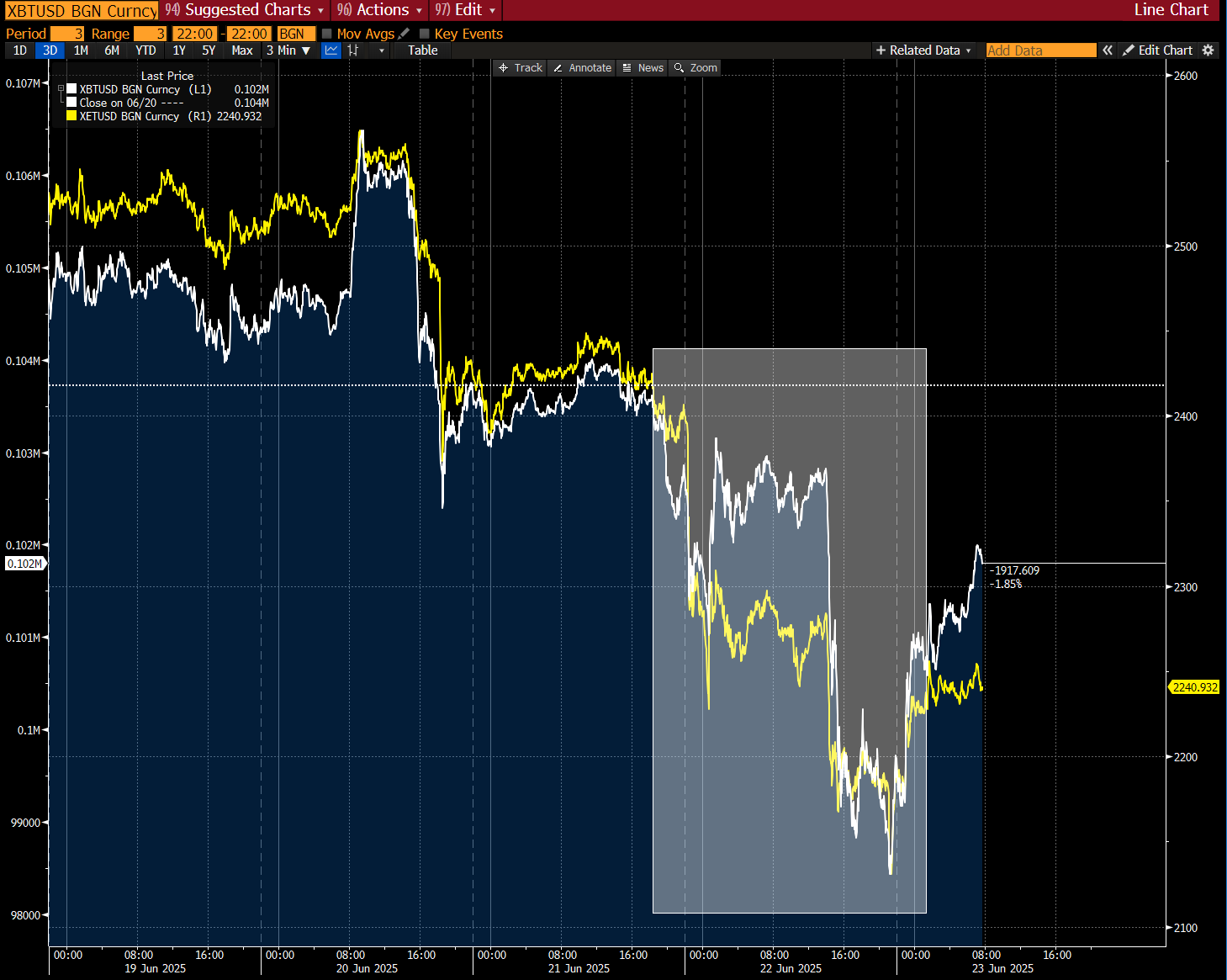 Risk sentiment is already on the back foot, and crypto is leading the way. Bitcoin dropped nearly 4% from Friday’s close, with Ethereum off ~10% over the weekend. That’s a signal that investors are repricing geopolitical risk ahead of broader market open.