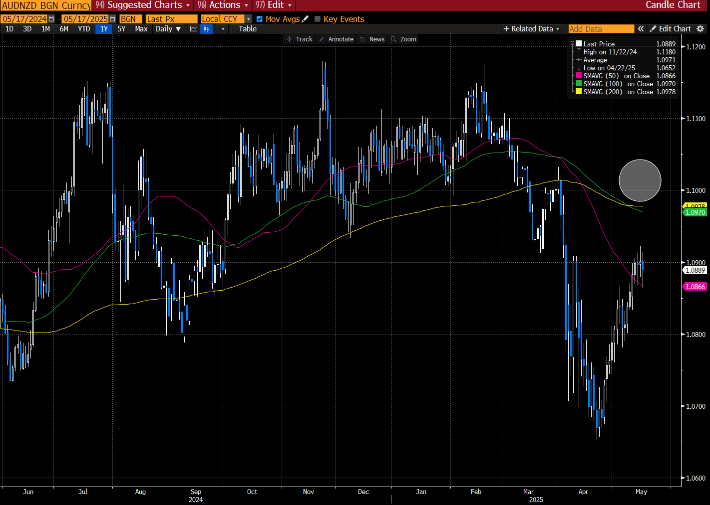 From a technical perspective, AUD/NZD could look to trade up to circa 1.0970 before it meets the 200 DMA, with any break from there likely clearing 1.1000.