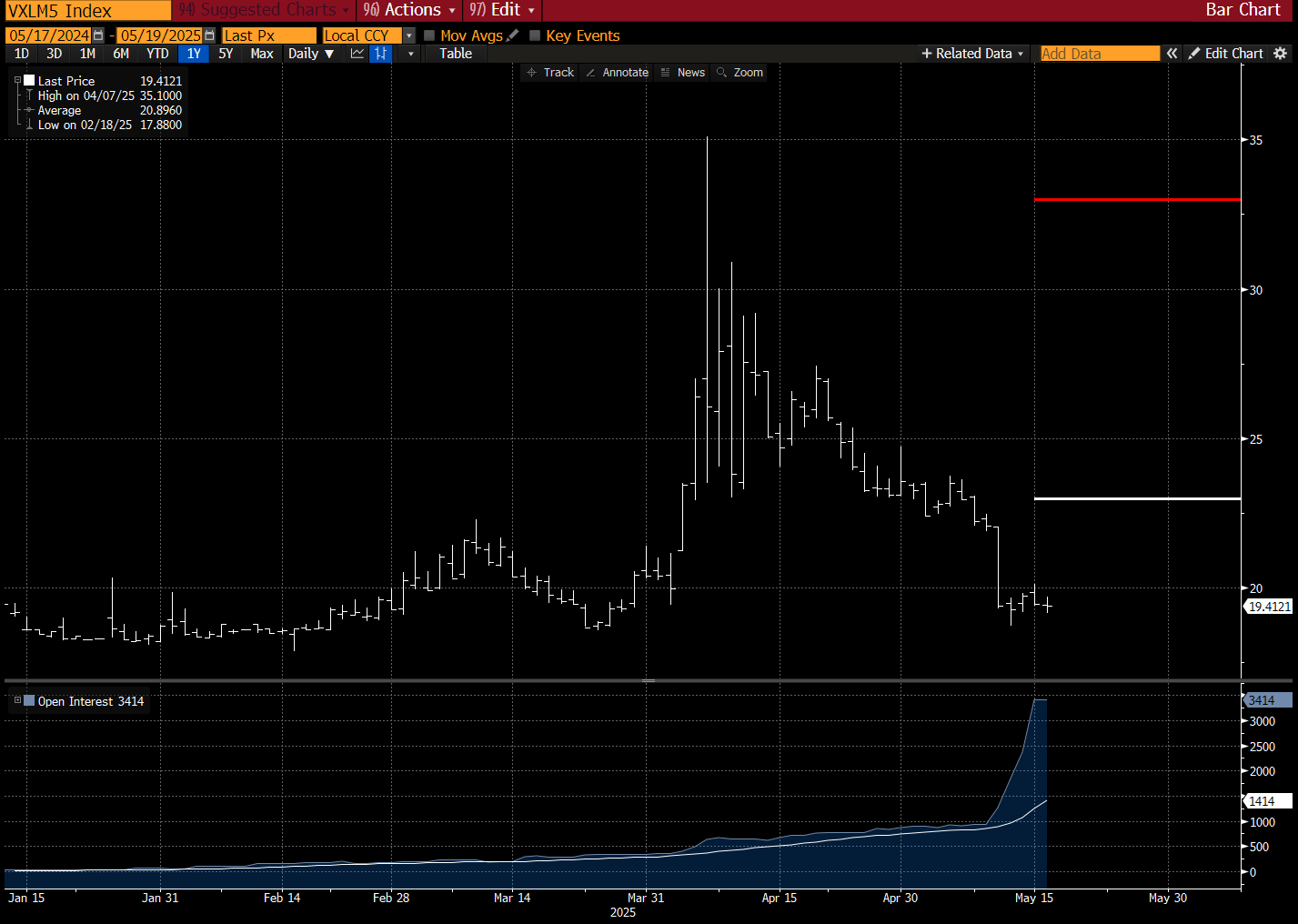 Buy a 23 / 33 Call spread on VXLM5, with a max payoff of circa 9:1