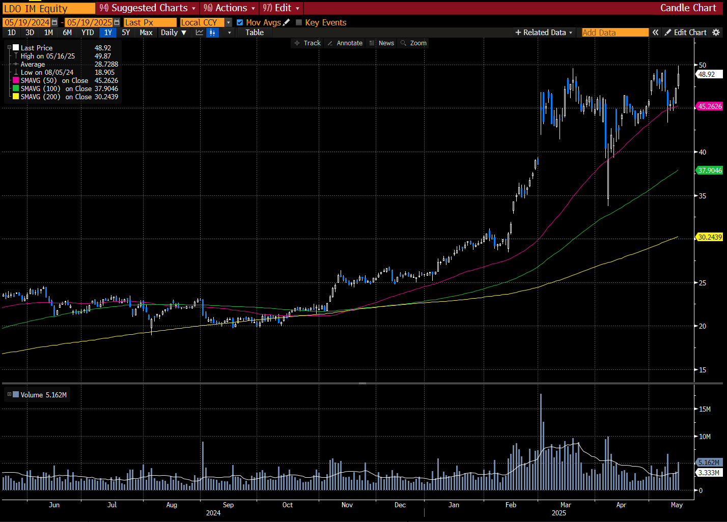 The fundamentals are lining up. Q1 results came in strong across revenue and EPS, with upbeat guidance and growing conviction around multi-year earnings growth. Leonardo’s diversified platform, from helicopters to electronics, positions it as a core supplier in Europe’s rearmament push.