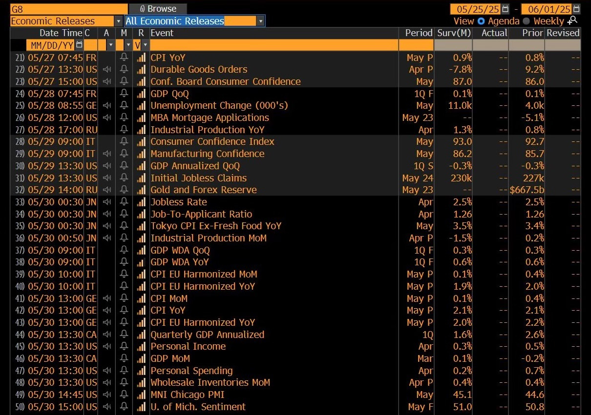 Markets head into the week with renewed focus on US trade policy after President Trump’s threats to Europe raised fears of a broader trade war, adding to inflation concerns already roiling bond markets. Investors will be watching US PCE inflation data, consumer confidence, and Fed minutes closely for signs of how the central bank plans to navigate rising price pressures alongside slowing growth. Long-dated Treasury yields have surged in recent days, driven by concerns over deficit expansion following the House’s passage of Trump’s tax-and-spend bill and Moody’s downgrade of US sovereign credit.