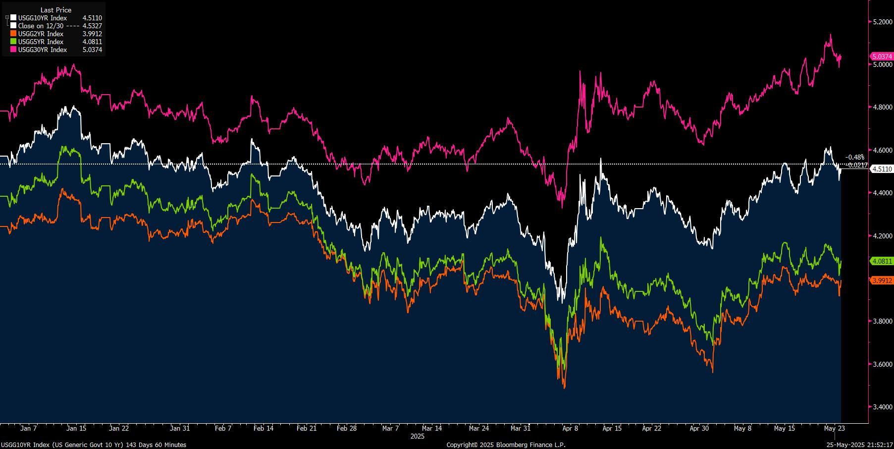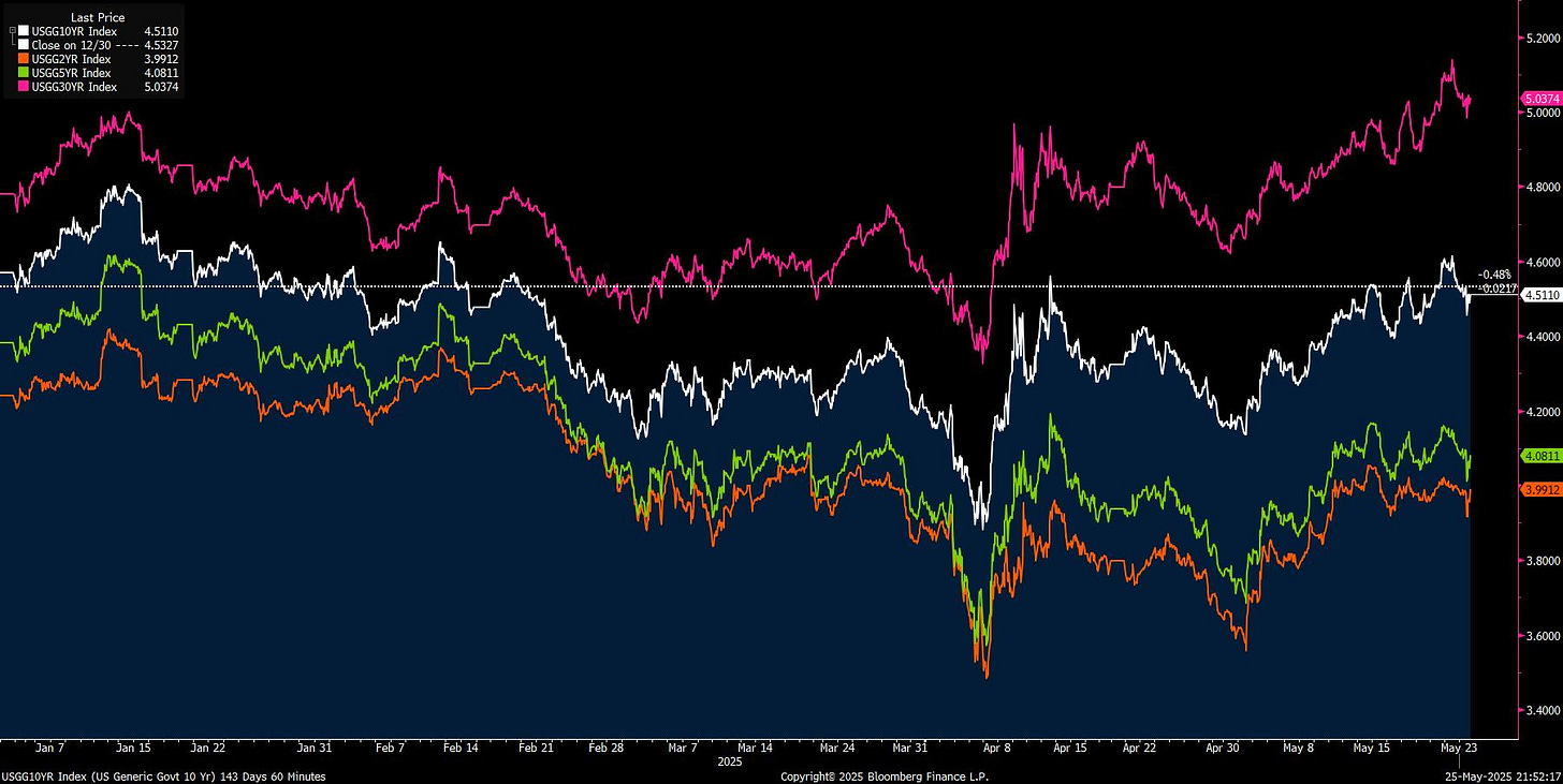 Fiscal concerns resurfaced as the Senate signalled changes to Trump’s tax and spending package that could bump up against the debt ceiling again. Bessent also stated last week that they plan to grow the economy faster than debt to stabilise the debt-to-GDP ratio. Scrap the “detox”, kick the can down the road, and run the economy hot. It’s a slight U-turn on their earlier statements.
