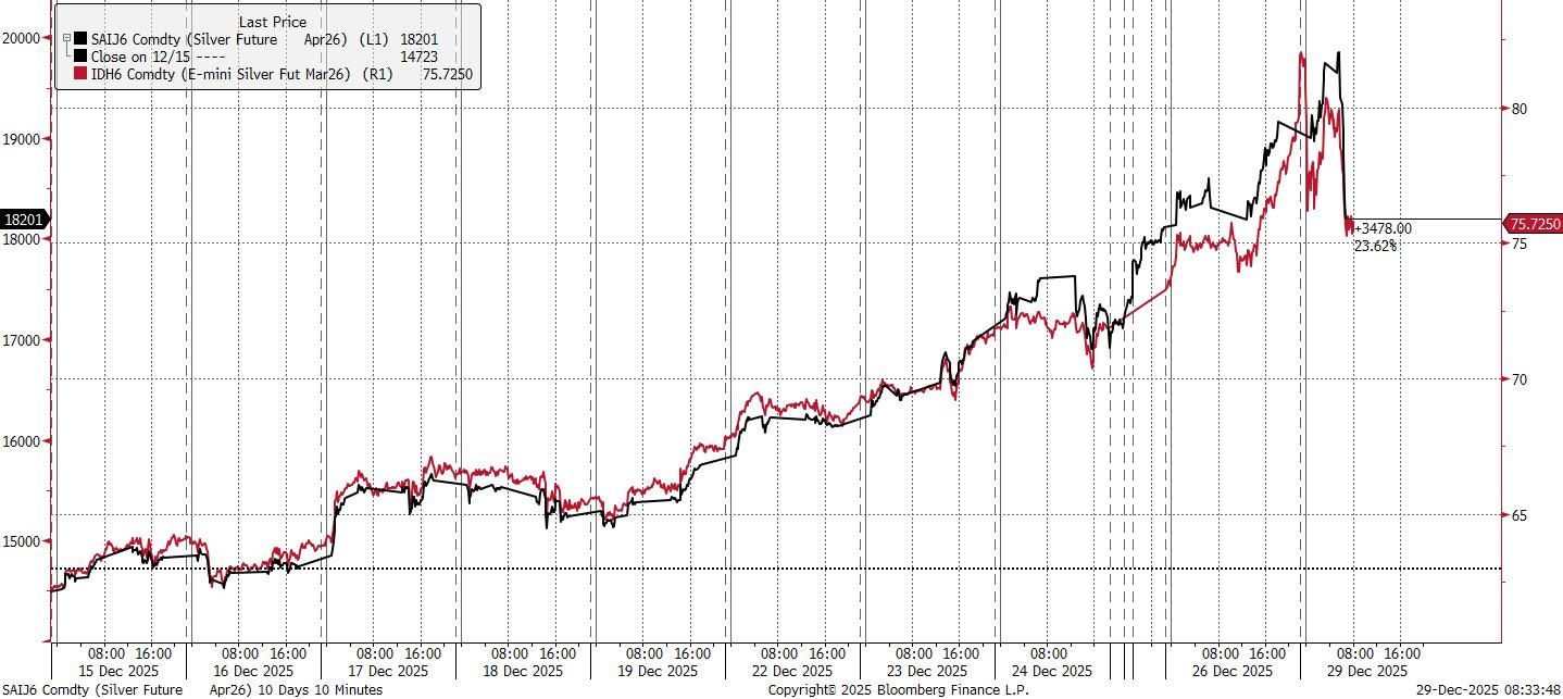 Silver’s move last week was about plumbing. China’s decision to impose export licensing from January reframed silver as a strategic material rather than a passive commodity, tightening a market where physical availability was already strained. The response showed up immediately in price dislocations: Shanghai and Dubai traded at double-digit premiums to COMEX, while the London forward curve remained in backwardation—the market paying more for metal today than for promises tomorrow.